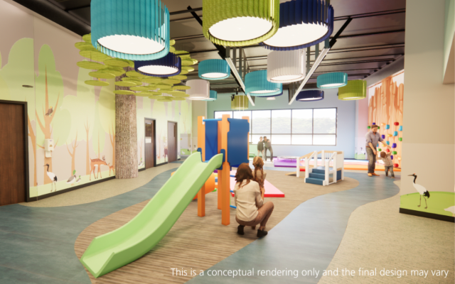 The space accommodates a broad range of pediatric health diagnoses, including broken bones, cerebral palsy, Autism, genetic disorders, general developmental delay and more.
